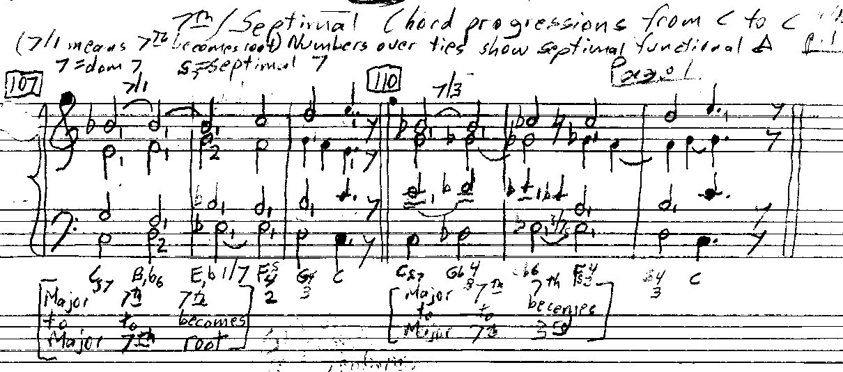 We are going to talk first about the simplest septimal progressions (above), where the septimal seventh note becomes the root or third of the next chord. In our first example (measure 107), the B1b is the seventh of C. It’s sounded in the soprano part and held over to become the root of a B1b Major chord.  Then we move a fifth to E1b Major. This gives us a moment of “grounding”  in the new harmonic realm. That’s helpful, because as I said before, the transition from a C septimal seventh chord to a B1b chord means microtonal pitch shifts in three of the four notes.  From the E1b chord, we transition back towards C. The root of the E1b chord becomes the septimal seventh of the F septimal seventh chord. From there, we go to a regular G7 chord and back to C. Stepwise progressions are very helpful, which is why I created a walking bass line using a few inversions. The harmonic movement in septimal transitions is so new and big, I try to make everything else as smooth as possible….