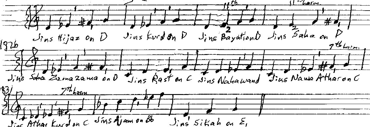 The Ajnas are the “Building Blocks” of the maqams (or maqamat). They are similar to and possibly inspired by the Greek tetrachords: “partial” three, four or five-note scale parts which are then combined to form a complete maqam (scale). The eleven most-used Ajnas are built on five different tonics:  5 on D Tonic, 4 on C Tonic, one on B1b Tonic, and one on E1 Tonic.
